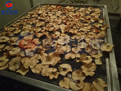 二、攤放在物料托盤上,蘋果片都裝好后,推入蘋果片烘干機內進行烘干